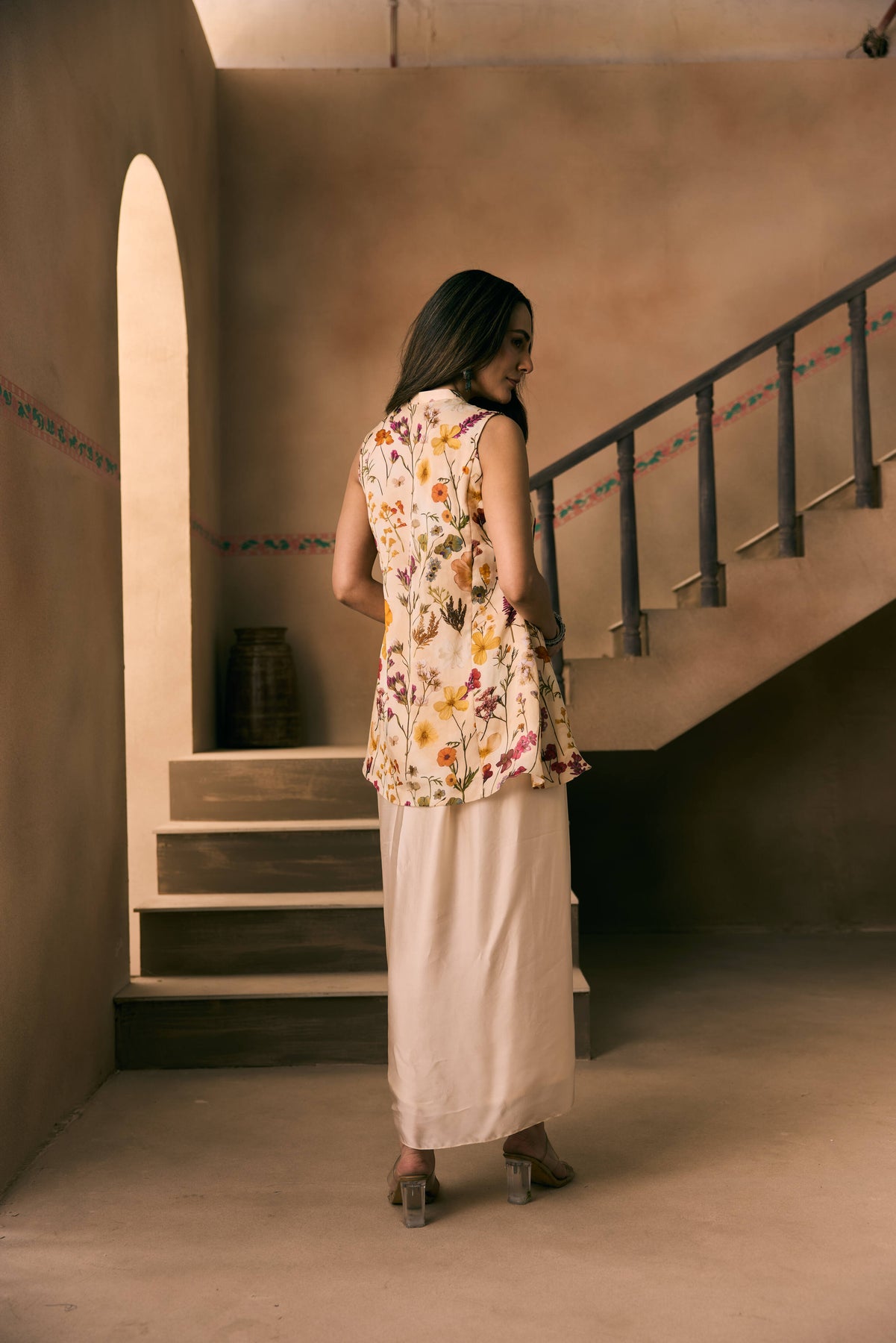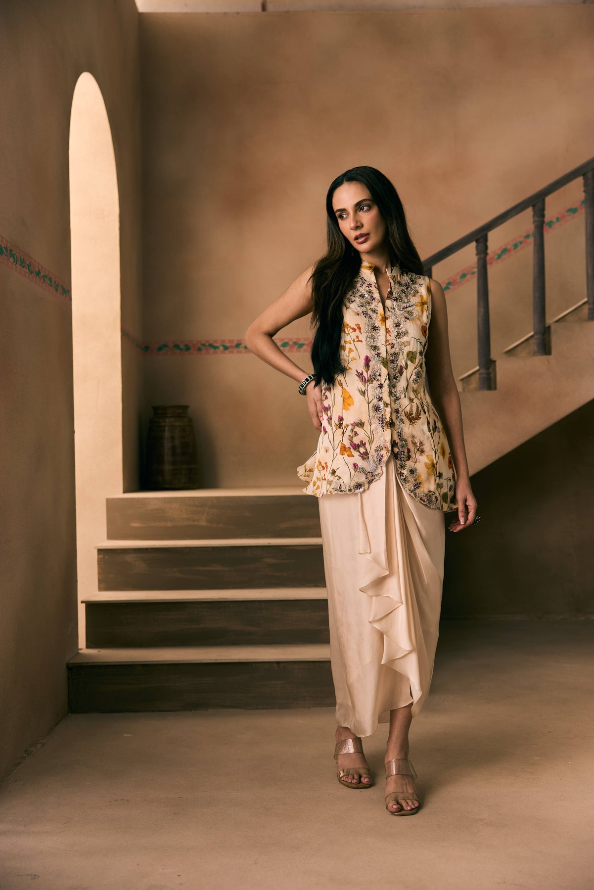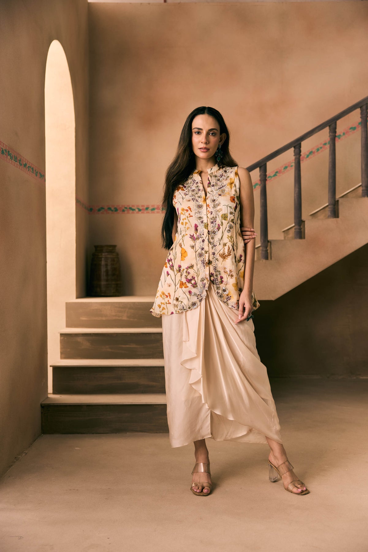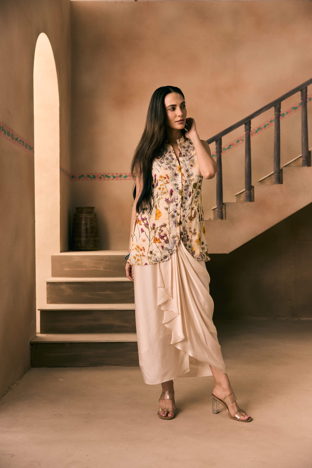 Featuring a Printed embroidered Satin Organza kurta with cutdana, beads and thread work teemed with a Draped Skirt.