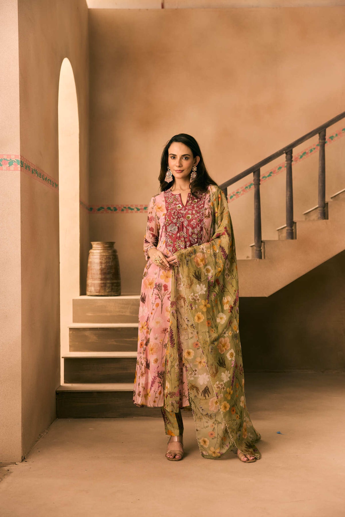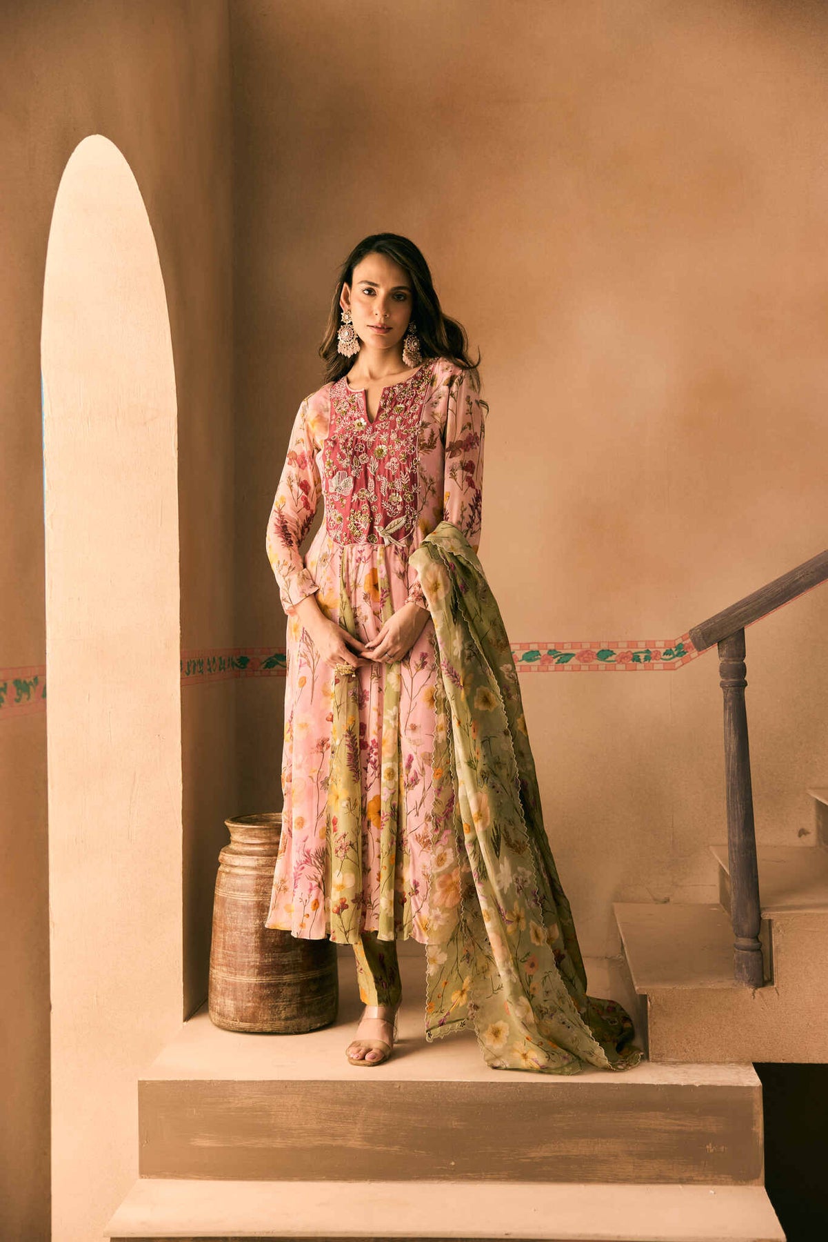 Featuring a Pink Printed Georgette hand embroidered Kalidar Kurta with cutdana, beads and thread work teemed with a Printed Pant  and a embroidered bordered Printed Viscose organza dupatta.