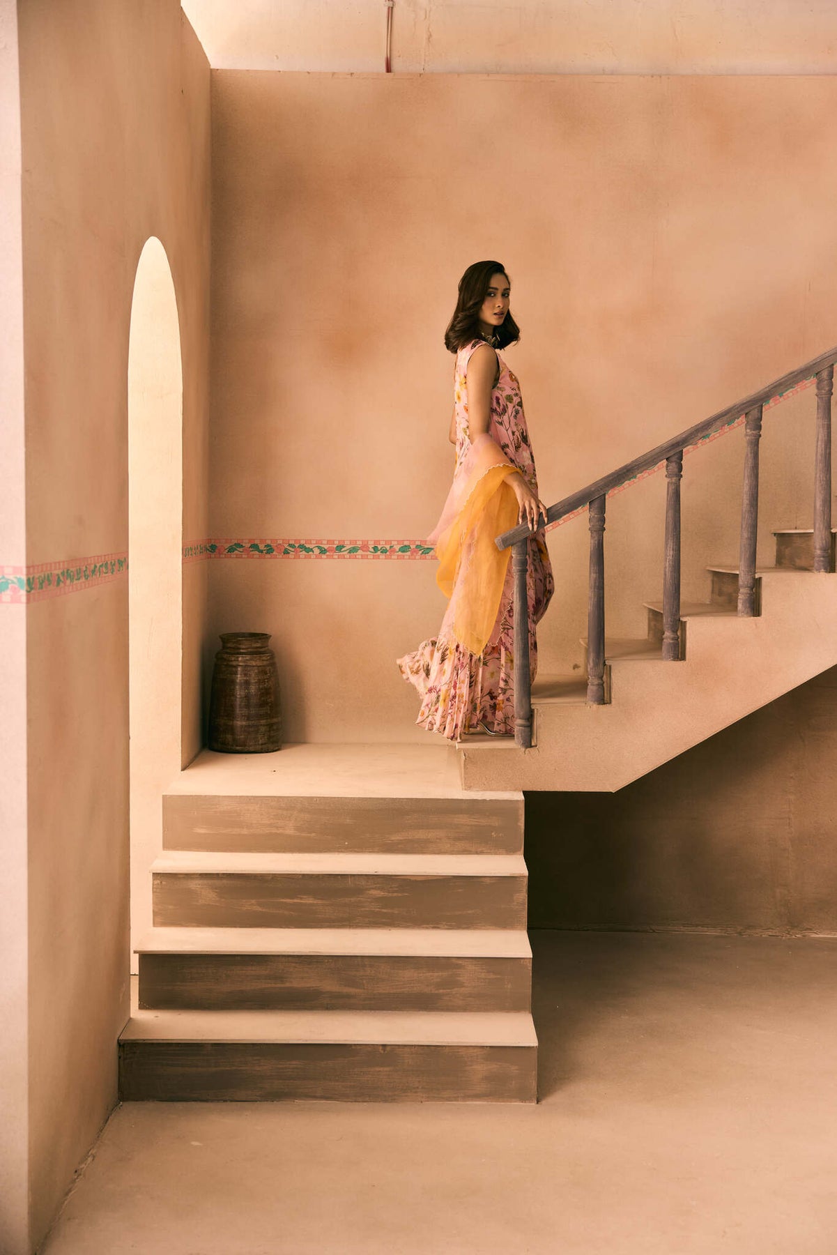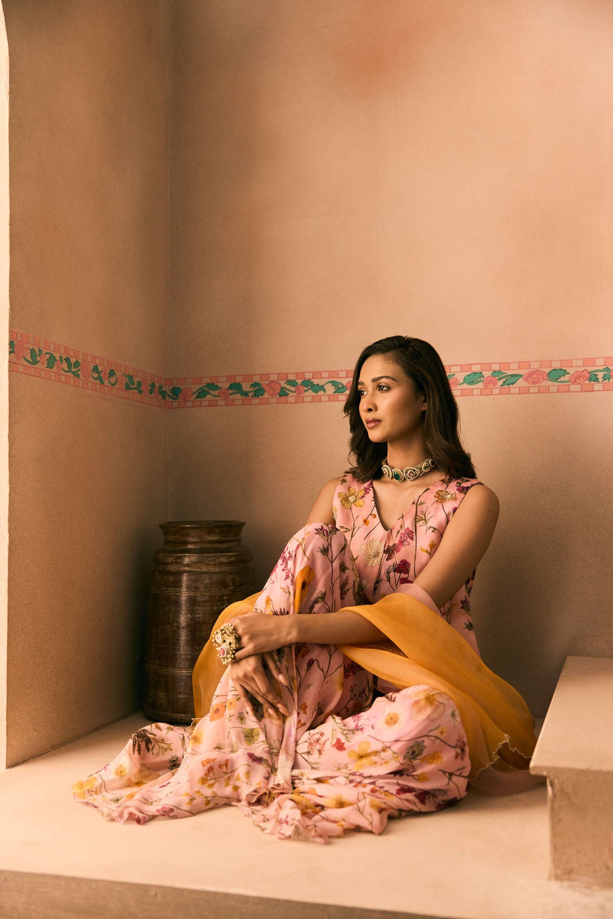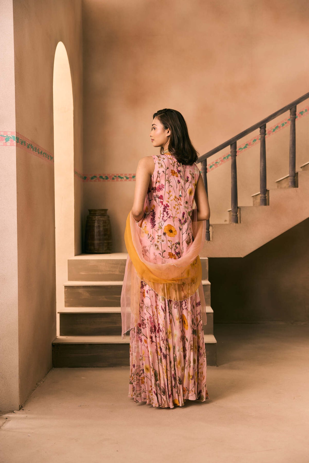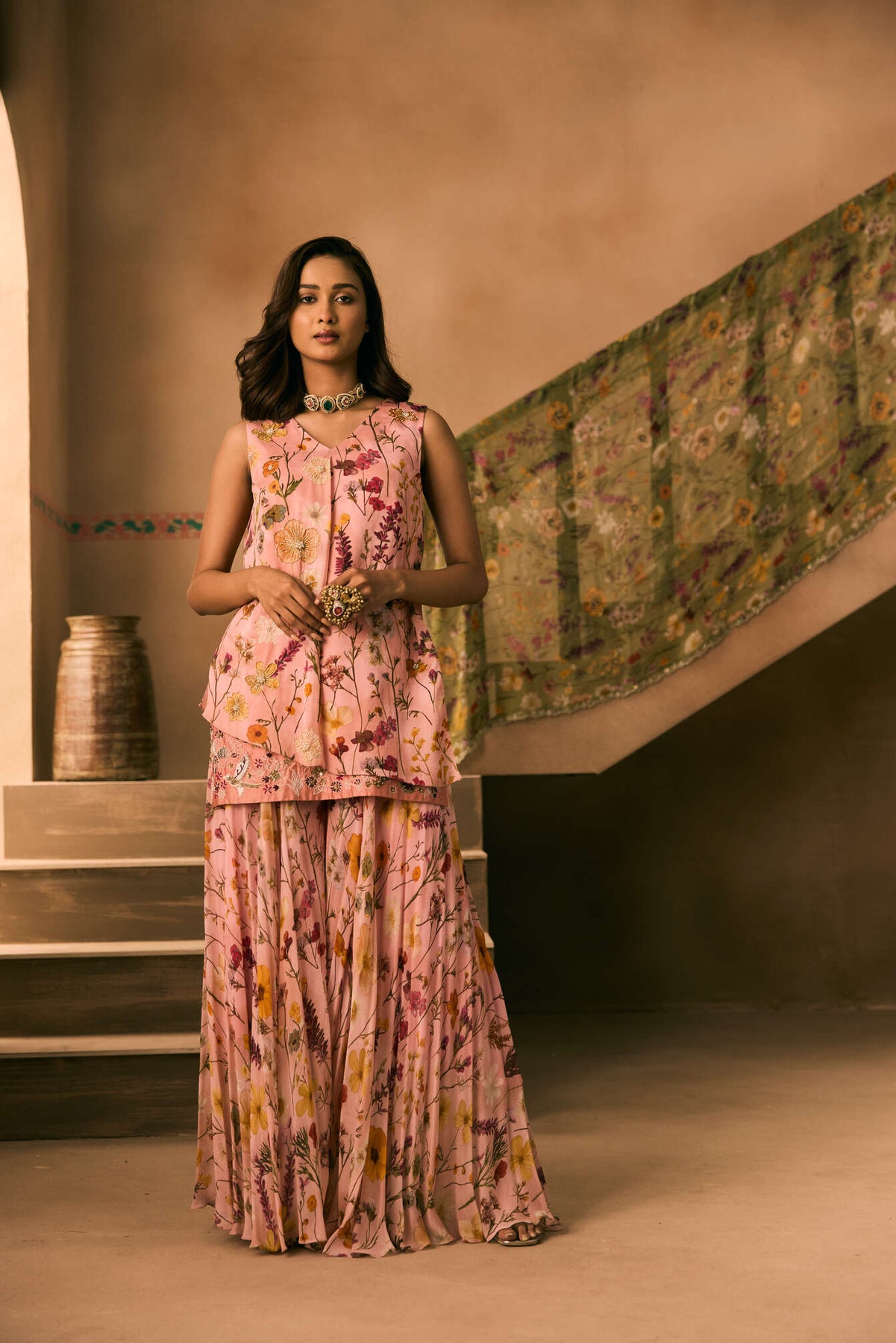 Featuring a Printed short Kurta hand embroidered with cutdana, beads and thread work teemed with a Printed Sharara. and a Shaded scallopped dupatta.