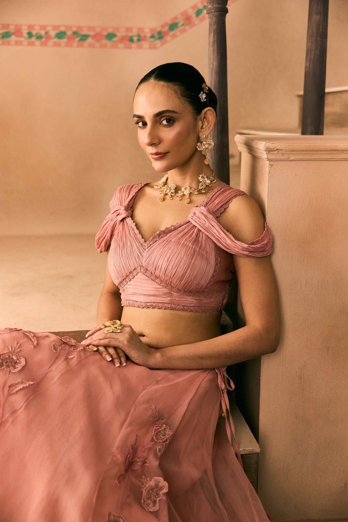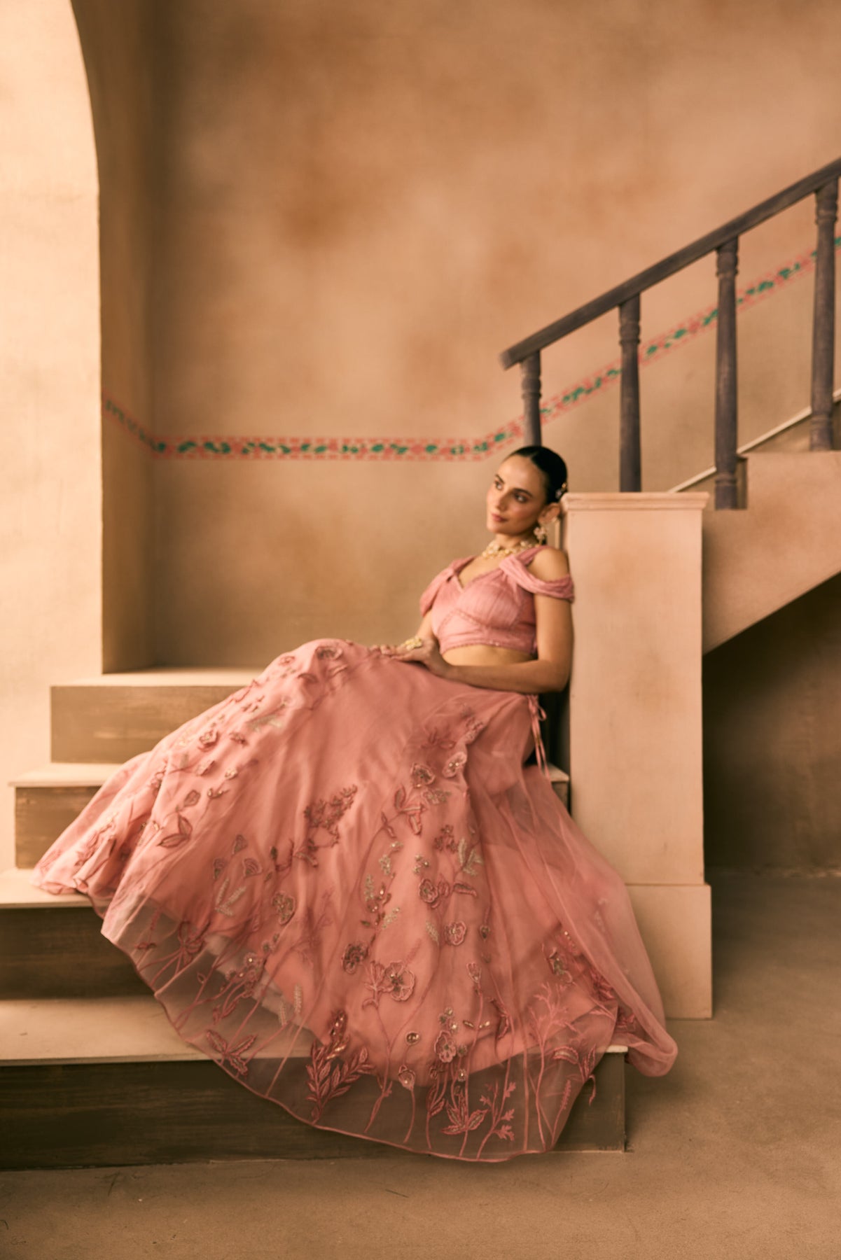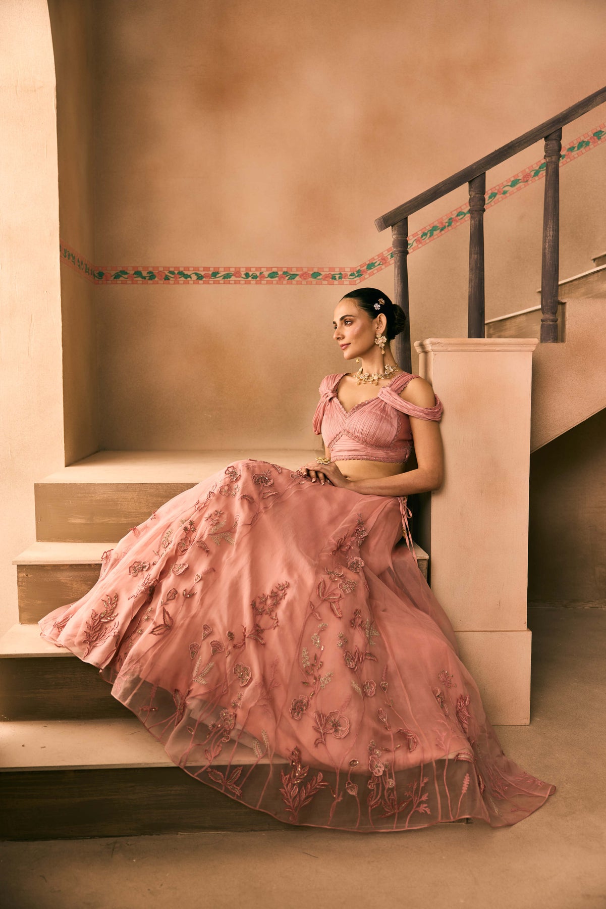 Featuring a viscose organza embroidered 3D flower with cutdana, beads and thread work lehenga teemed with a embroidered crushed chanderi blouse a embellished duputta.