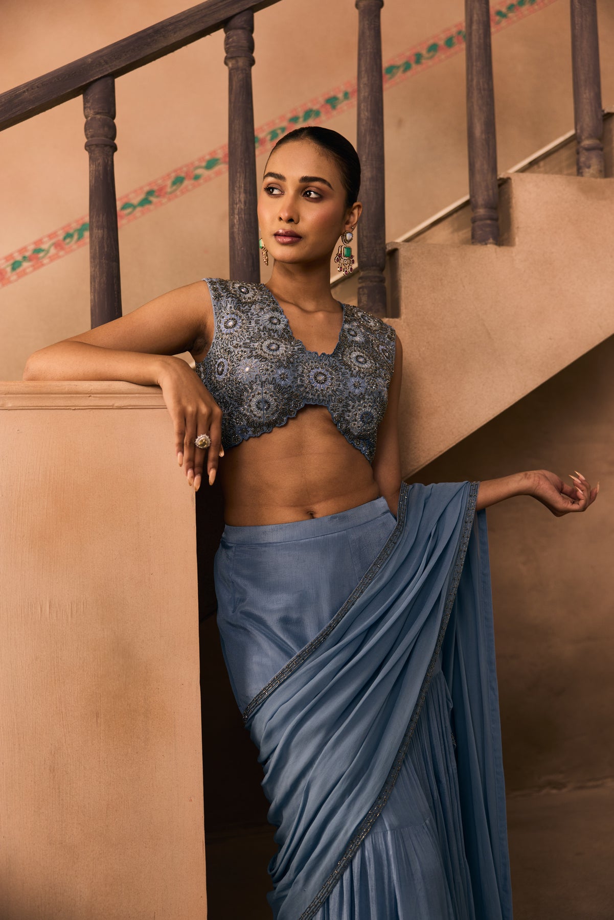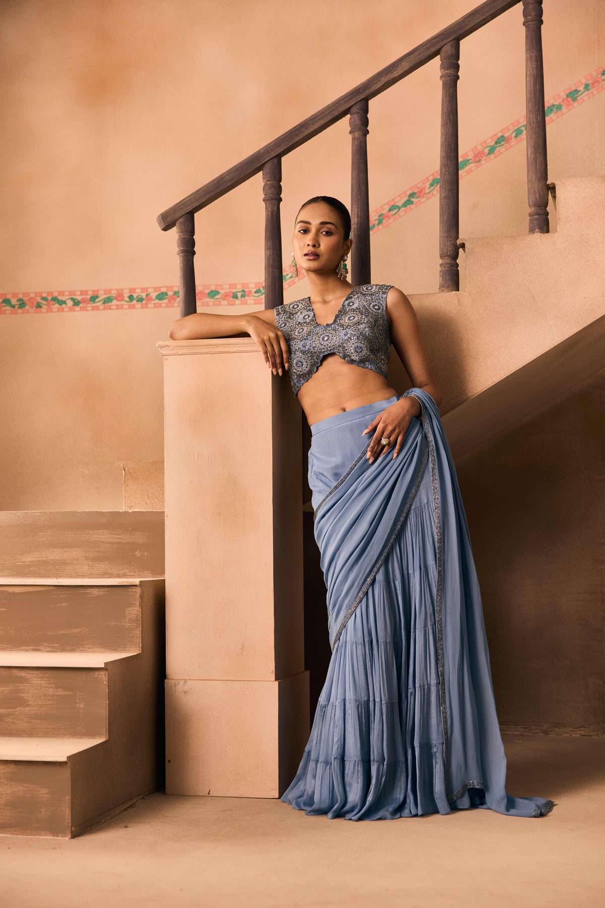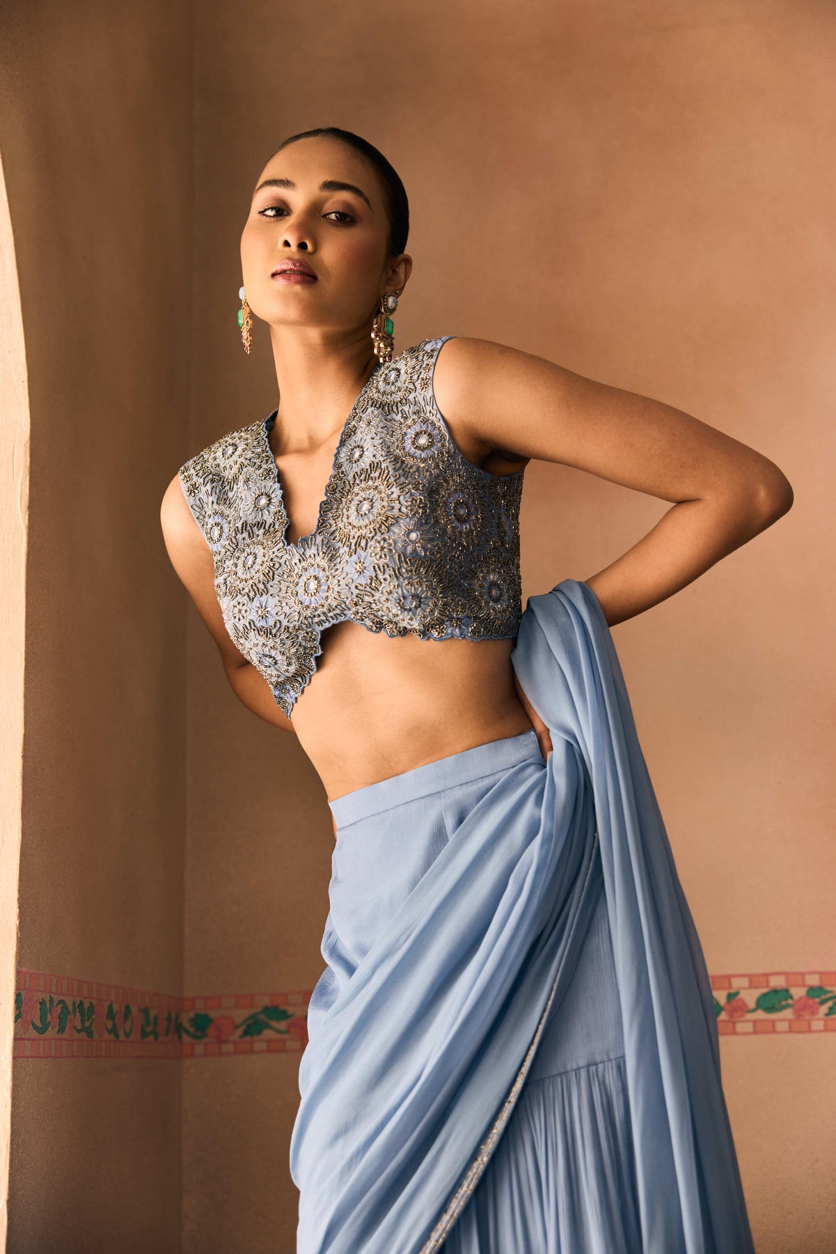 Featuring a Chennon Tiered hand embroidered Drape Skirt with cutdana, beads and thread work teemed with a chanderi embellished blouse and a embroidered bordered Geogrette dupatta.