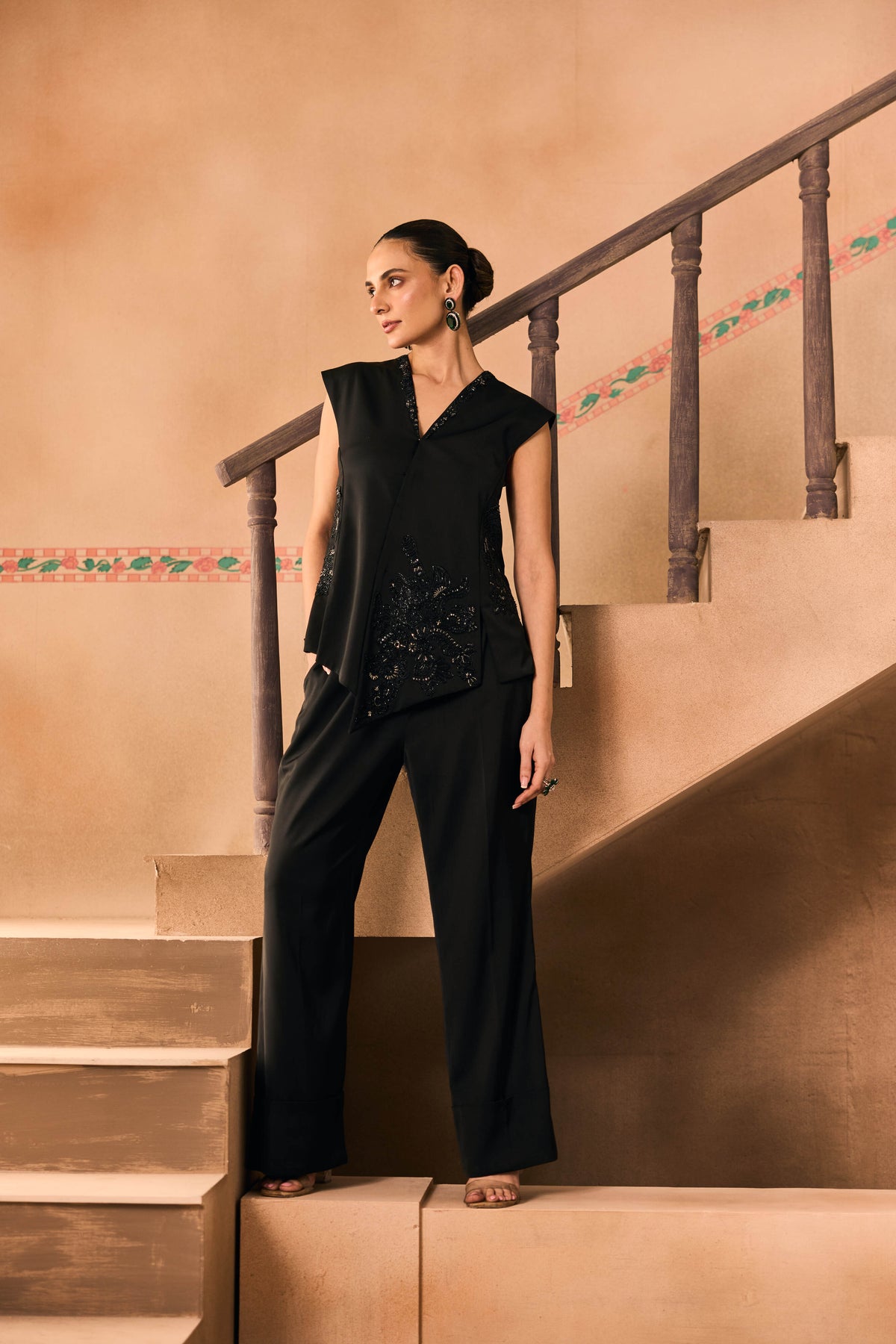 Featuring a Black Satin sleeveless Jacket with thread and katdana embroidery teemed with a pant.