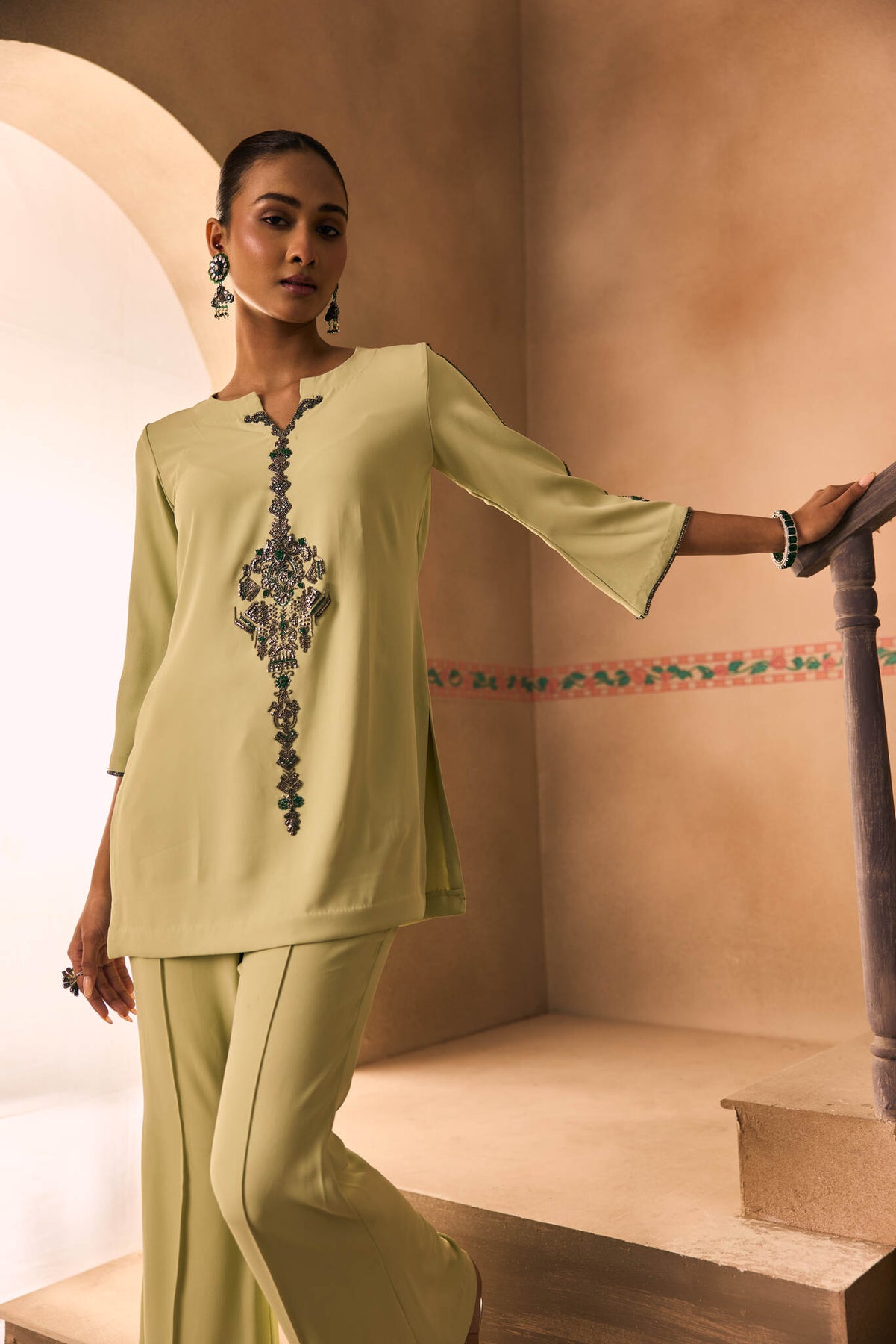 Featuring a with thread and katdana embroidery teemed with a pant .