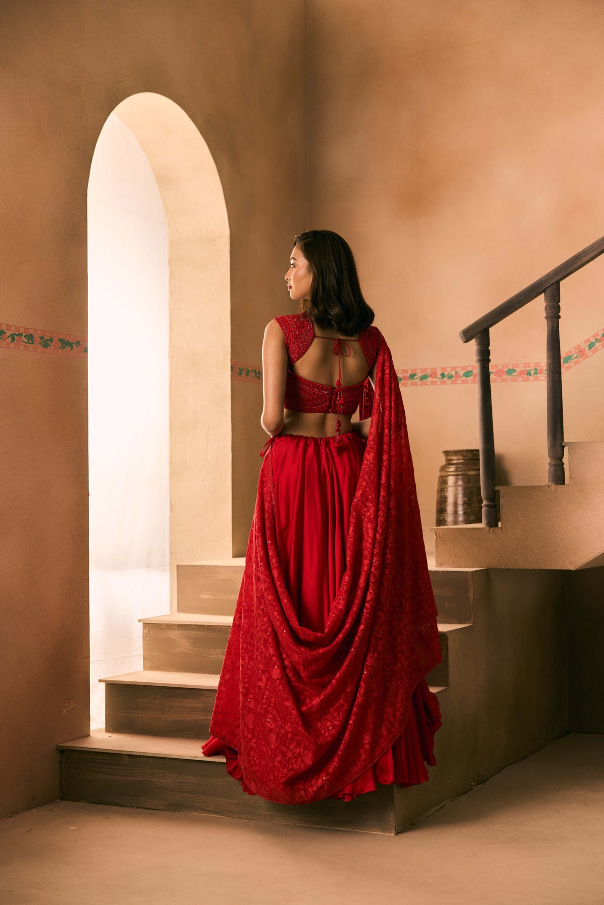 Featuring a viscose organza lehenga teemed with a embroidered chanderi blouse with cutdana, beads and thread work and a embellished bordered duputta.