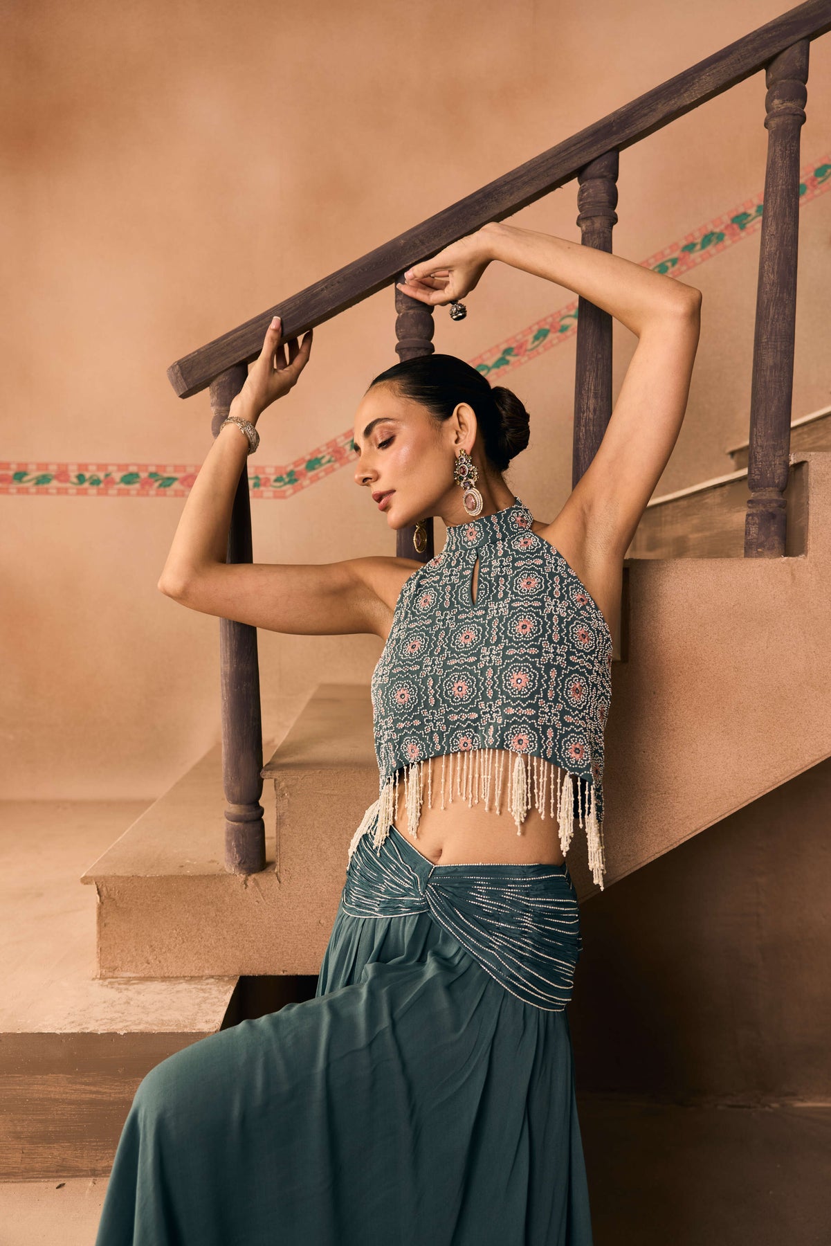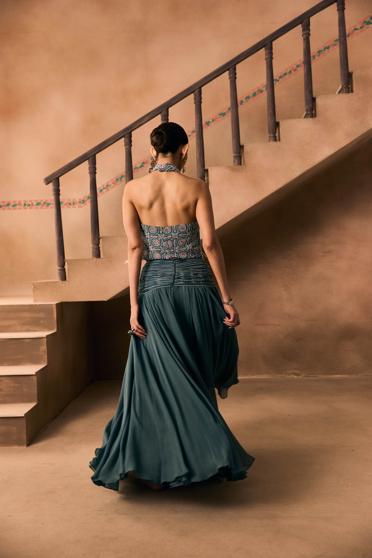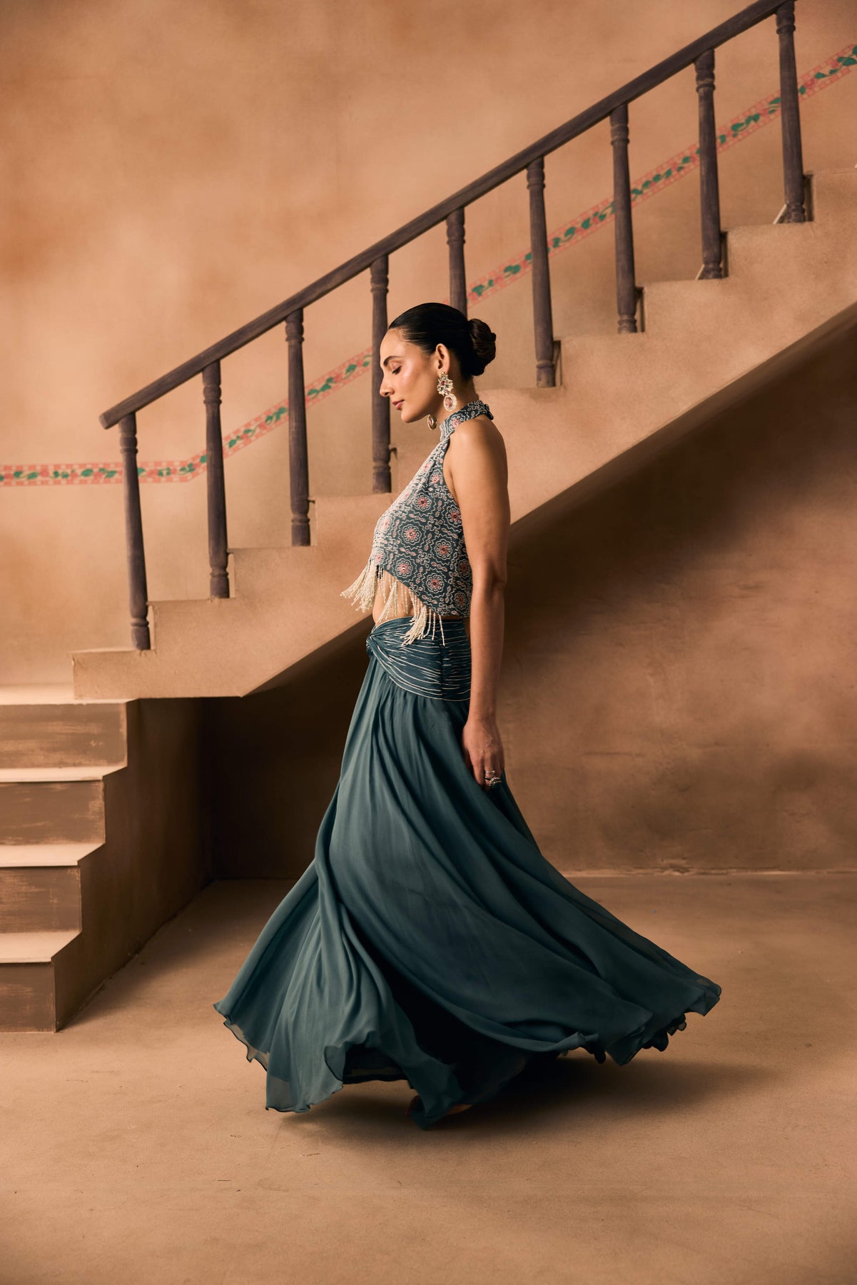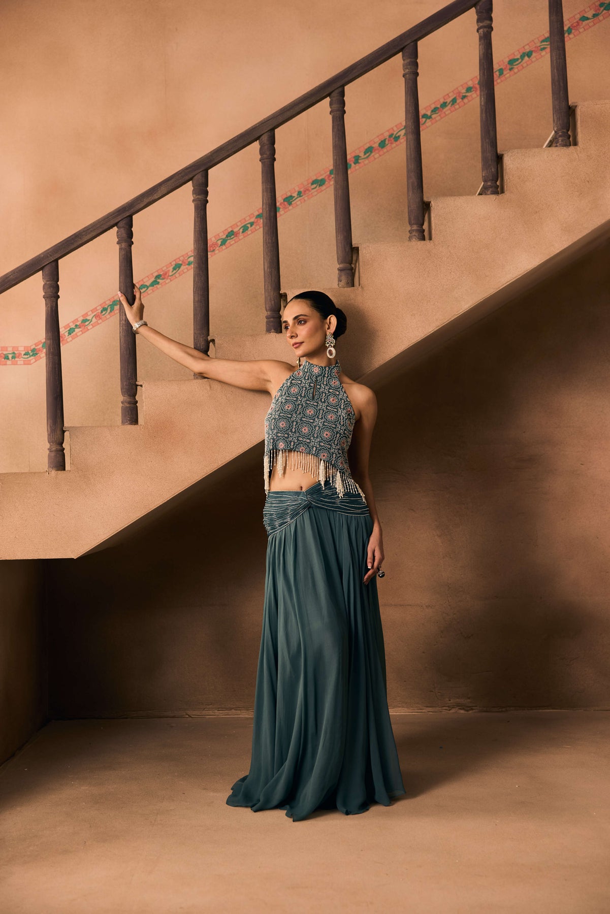 Featuring a Georgette hand embroidered Drape Skirt with cutdana, beads and thread work teemed with a Geogrette altered embellished blouse and a embroidered bordered Viscose organza dupatta.