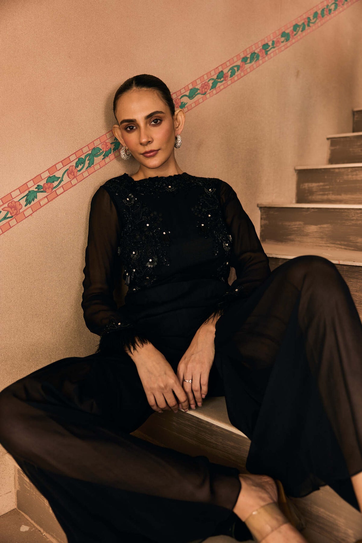 Featuring a Black Georgette jumpsuit with thread and katdana embroidery.