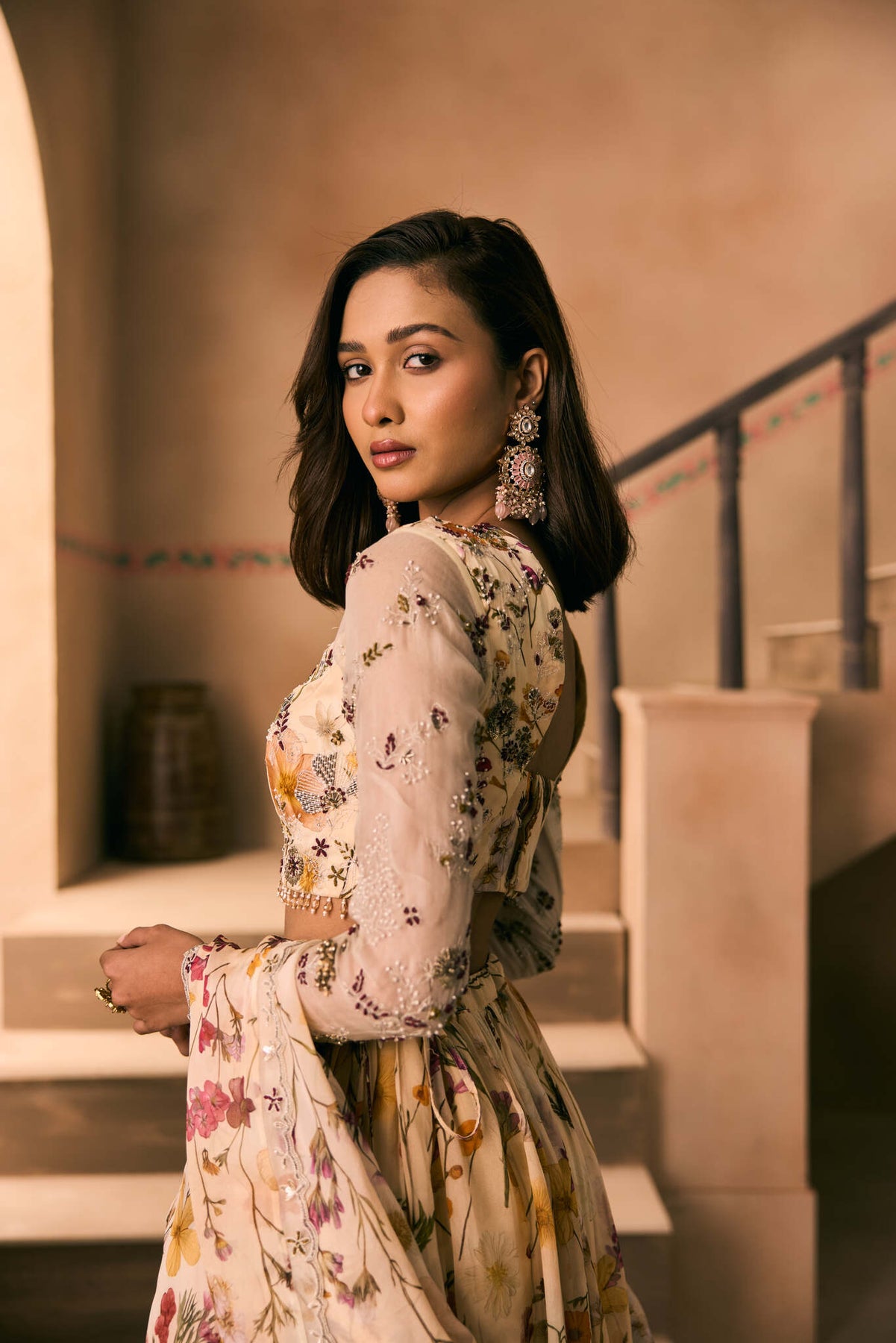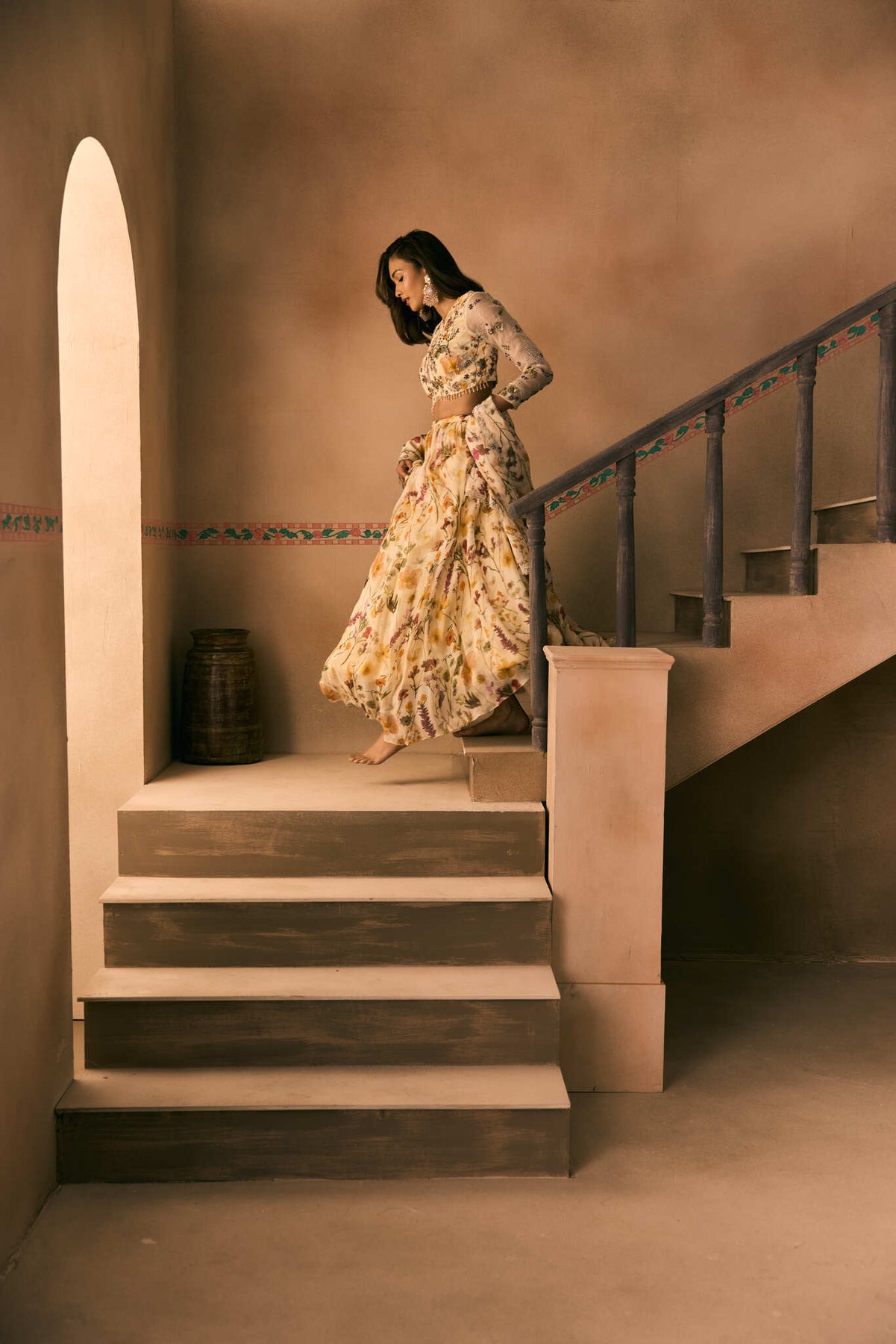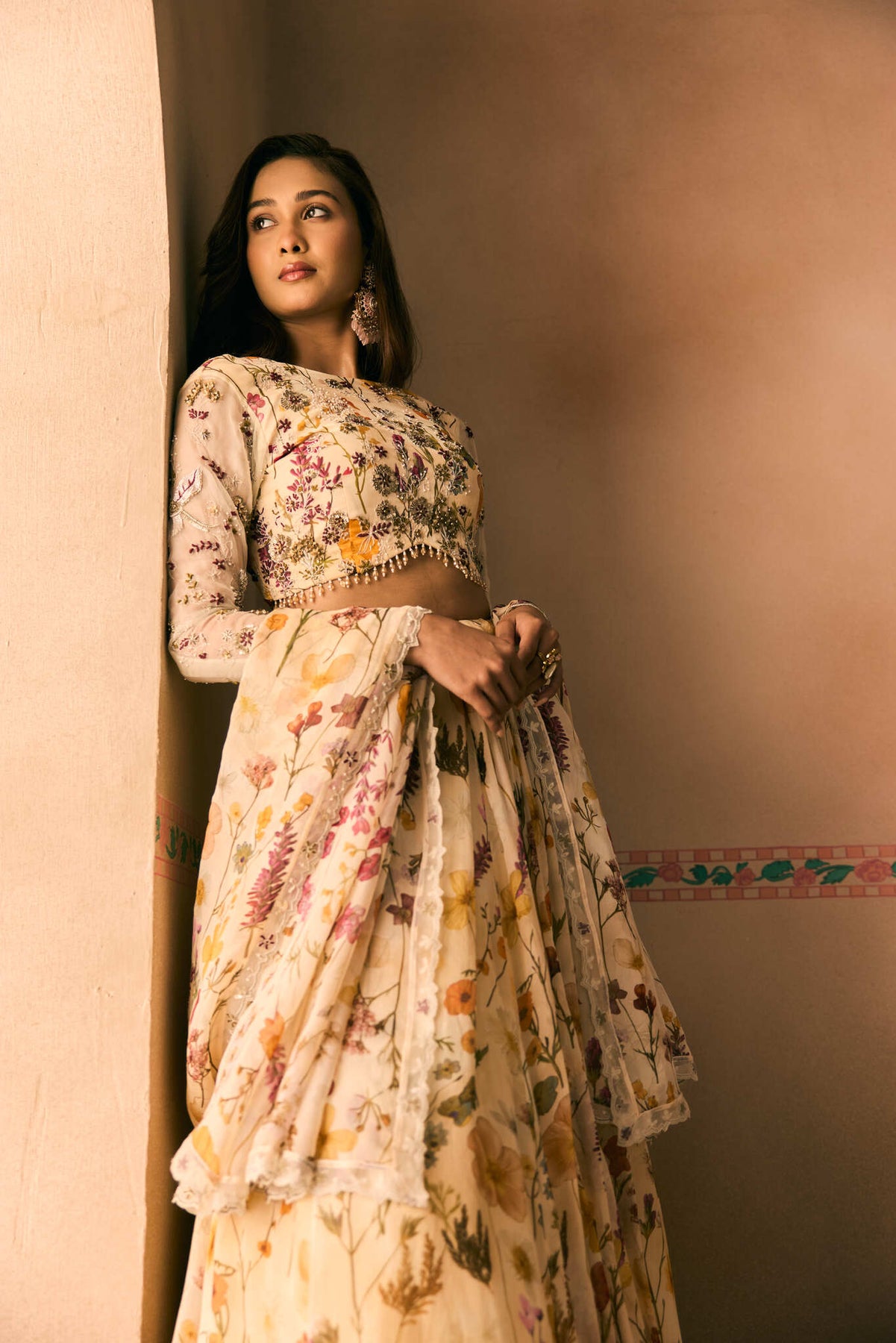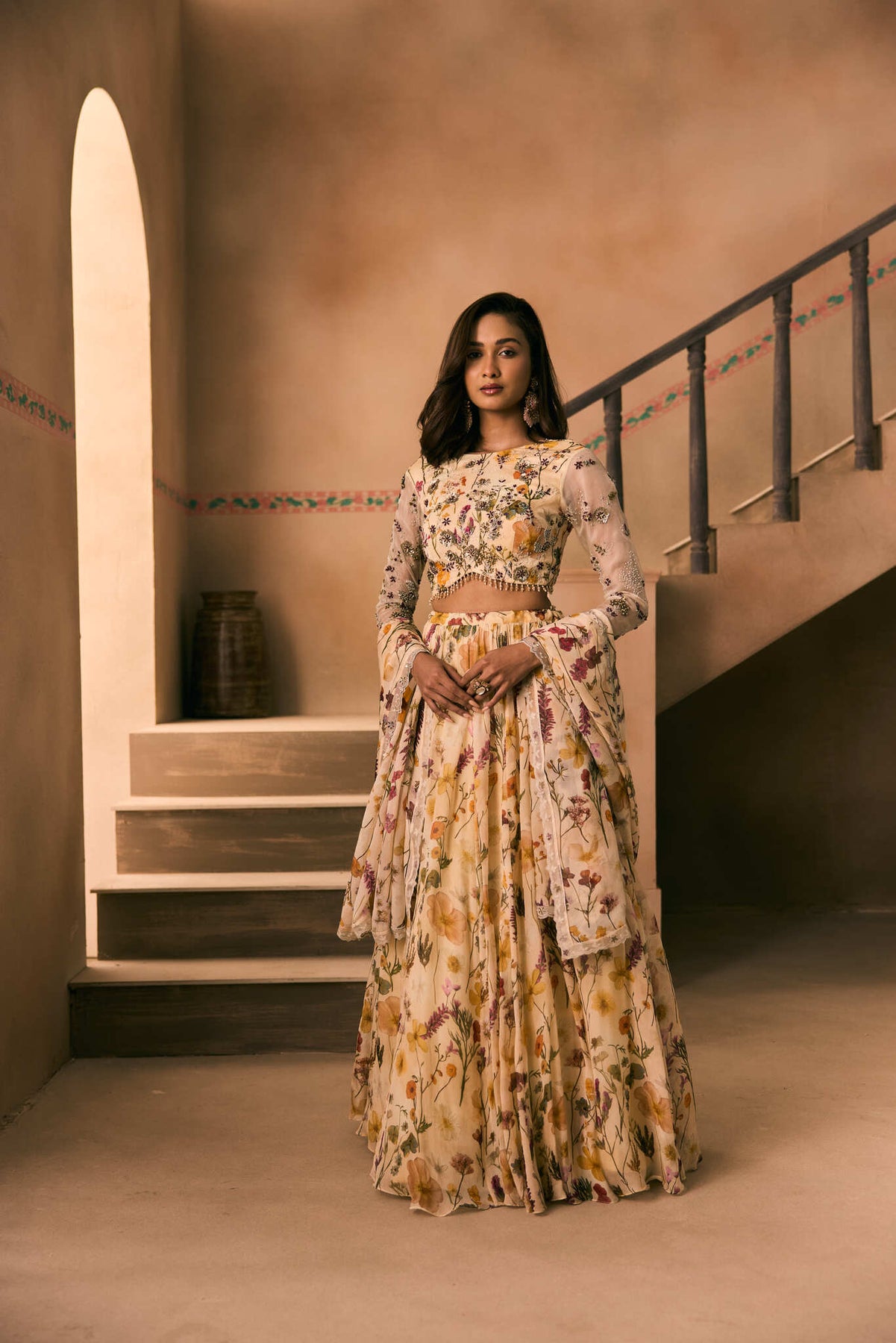 Featuring a Printed Lehenga teemed with a embroidered blouse with embellished organza sleeve with cutdana, beads and thread work and a embroidered brodered printed dupatta