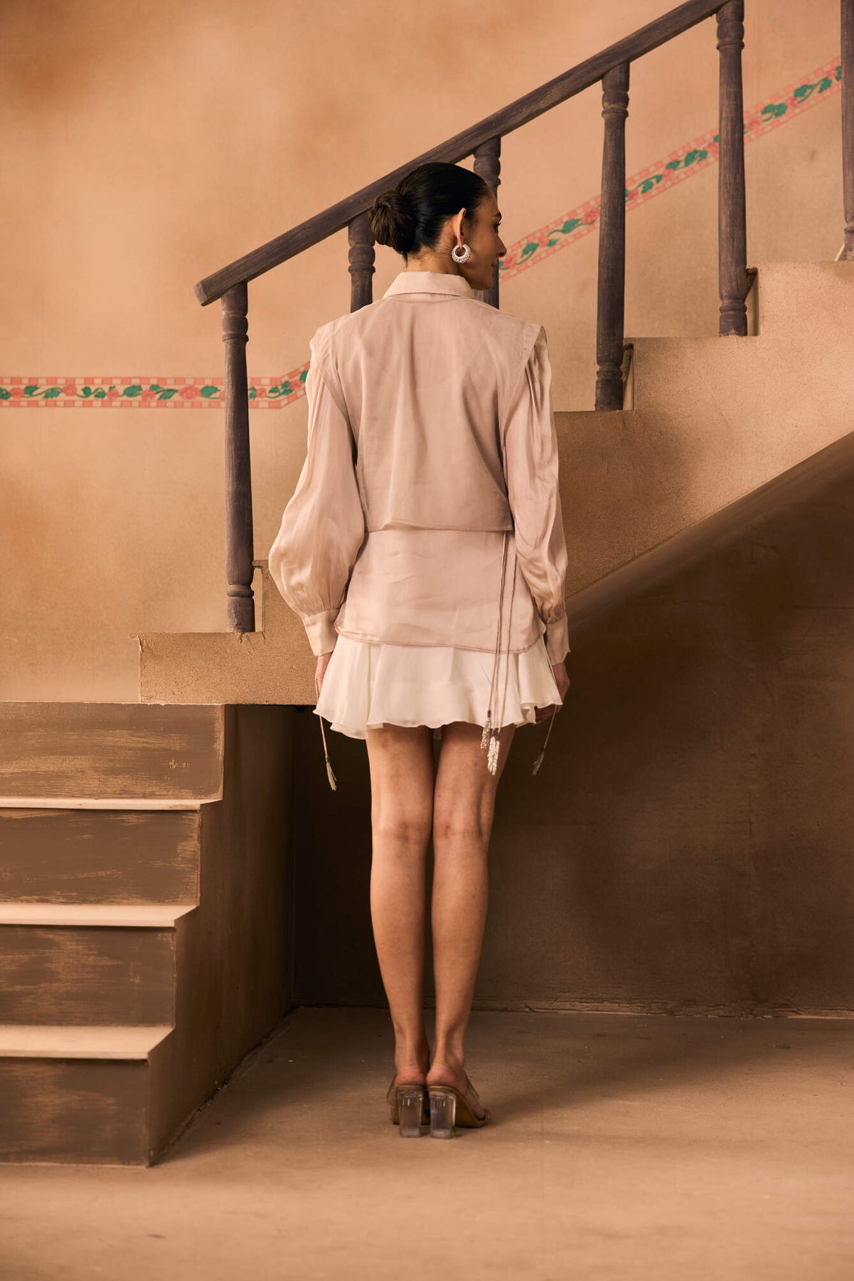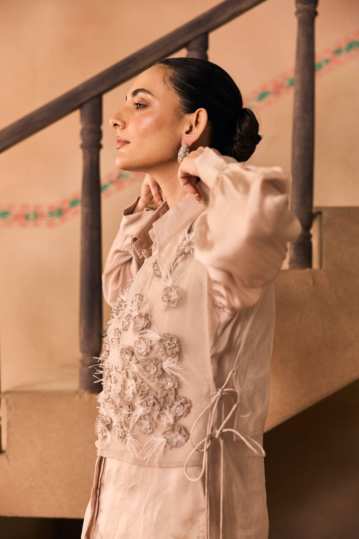 Featuring a Blush Pink Organza Shirt with a 3D flower net embroidered overlay.